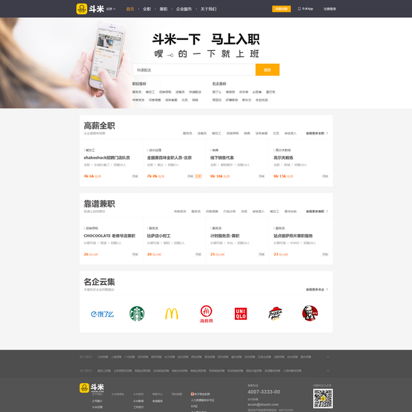 作為中國領(lǐng)先高效的一站式招聘服務(wù)平臺(tái),面向廣大基層崗位求職者,斗米提供安全、豐富的全職與兼職工作信息,并通過產(chǎn)品創(chuàng)新與服務(wù)保障,為用戶打造了更加良好的求職體驗(yàn),幫助求職者快速找到合適崗位。“斗米一下,馬上入職” 不只是一句口號(hào),更是斗米產(chǎn)品所秉承的服務(wù)愿景,截止2018年年末,斗米平臺(tái)用戶量超7600萬,位于行業(yè)前列。