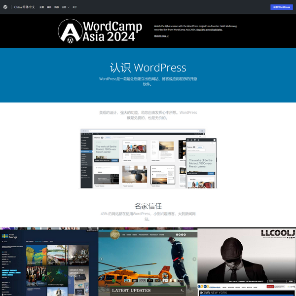 WordPress是一款能讓您建立出色網站、博客或應用程序的開源軟件。美觀的設計,強大的功能,助您自由發揮心中所想。WordPress既是免費的,也是無價的。43% 的網站都在使用WordPress,小到興趣博客,大到新聞網站。您可充分利用超過55,000個插件擴展WordPress,以讓您的網站滿足需求。您可以增加網店、相冊、郵件列表、論壇、統計分析等更多功能。